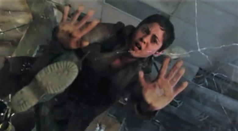 | Au sein du labyrinthe, Thomas entrain de fuir au griffeur. Le mur de gauche est entrain de s'affaisser vers la droite, ce qui tuera la créature. |